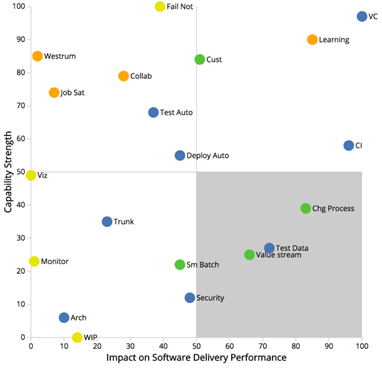 Op basis van de uitkomsten van de DevOps meting is het mogelijk een prioriteiten matrix op te stellen. Hierdoor ontstaat er een beeld van waar je organisatie nu staat, waar je als organisatie goed in bent en waar verbetering mogelijk is. Het geeft ook aan op welk onderdeel de meeste winst valt te halen daar waar het gaat om de performance.