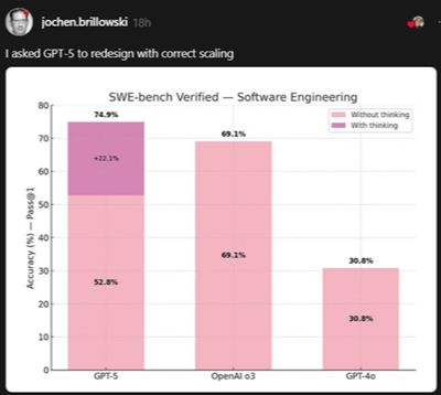 Gelukkig was een X (voormalig Twitter)-gebruiker zo slim om aan GPT-5 zelf te vragen om de grafiek te updaten die vervolgens met een verbeterde en correcte versie terug kwam: