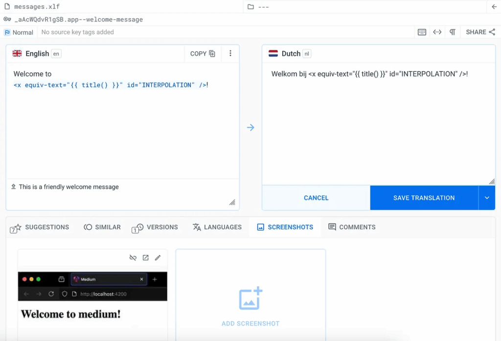 Na deze stappen kun je messages.xlf kopiëren, hernoemen naar messages.nl.xlf en in dezelfde map plaatsen. Je kunt je applicatie nu bouwen, maar er zijn nog geen vertalingen toegevoegd. Het handmatig onderhouden van meerdere talen kan tijdrovend zijn, dus het helpt om gratis open-source editors te gebruiken met Translation Memory, zoals POEdit. Op dit punt — gefeliciteerd — heb je Angular Localize opgezet volgens de standaard.