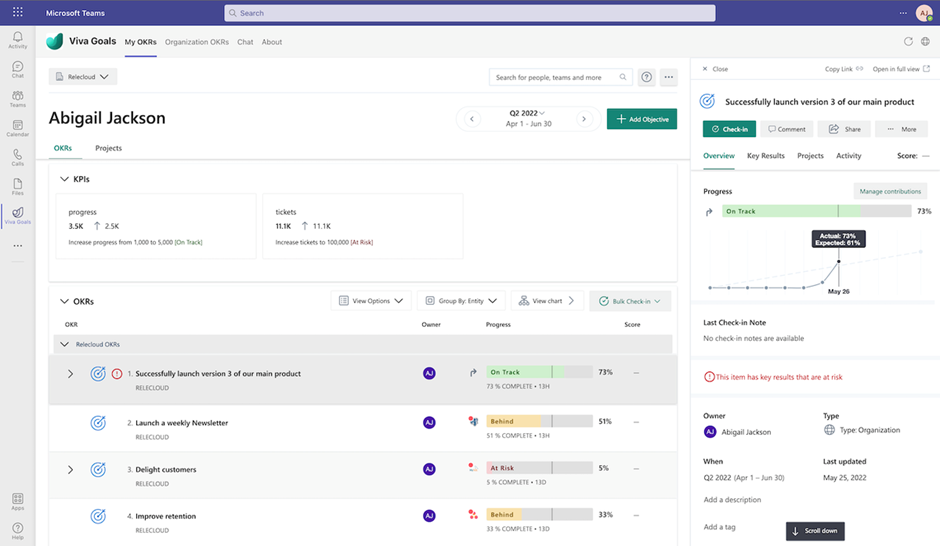 Met Viva Goals kunnen bedrijven hun doelstellingen definiëren om deze vervolgens te managen, verbeteren en aan te passen waar nodig. Hiermee wordt transparantie binnen de organisatie bevorderd en kunnen de taken van de werknemers gekoppeld worden aan de visie van de organisatie. De doelstellingen die zijn opgesteld kunnen geïntegreerd worden binnen Microsoft Teams en andere Microsoft 365 applicaties.