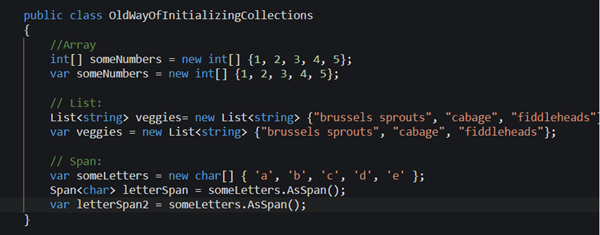 Om een nieuwe Array of List te creëren specificeren we het type of gebruiken we een var, maar is het ook nodig om new int[] of new list<string> te declareren. Met collections expressions heb je new en het type niet meer nodig. Je kunt collecties nu als volgt aanmaken: