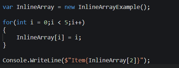 Het bovenstaande voorbeeld kan op een zelfde manier worden gebruikt als een normale array, maar zonder de grootte te hoeven definiëren. Verder heeft een inline array geen .Length attribuut en kan er geen LINQ worden gebruikt. Voorbeeld: