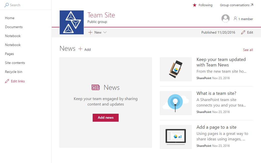 Zo ziet een nieuw aangemaakt Team Site er uit: