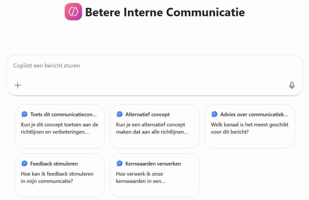 Bied ook één Copilot agent aan de afzenders van interne communicatie aan. Daarmee wordt de impact van berichten verder vergroot. Met die Copilot agent kun je concepten laagdrempelig laten toetsen aan interne richtlijnen, aanzetten tot verbetering en wijzen op de meest geschikte oplossing voor publicatie. Vereist jouw organisatie beoordeling van een bericht door een redactie voordat het geplaatst wordt? Door de Copilot agent dan voortaan de eerste beoordeling te laten uitvoeren, neemt het werk voor de redactie af. Dat scheelt!
