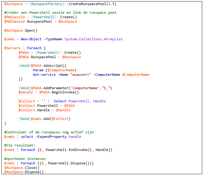 In dit voorbeeld maken we 5 powershell runspaces aan, halen we de gewenste Windows Service op en geven we deze weer, voordat het runspace weer afgesloten wordt.