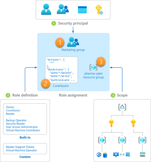 In bovenstaand voorbeeld heeft de “Marketing group” (1) de rol van “Contributor” (2) op de resource group “pharma-sales” (3) en de resources die in die resource group geplaatst zijn. Een rol definitie bestaat uit een set aan permissies voor algemene rechten op resources, rechten specifiek voor bepaalde type resources. Azure heeft een grote lijst met built-in rollen, maar je kunt ook zelf rol definities opstellen en gebruiken.