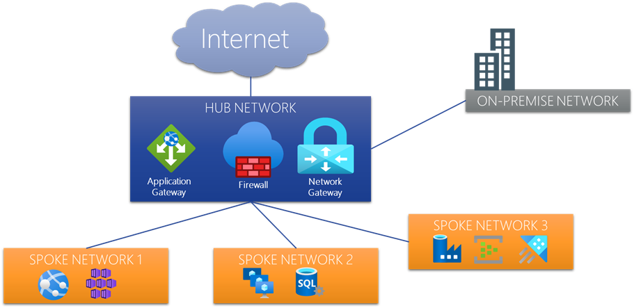 De spoke netwerken zijn de netwerken waaraan de benodigde Azure resources voor de diverse toepassingen gekoppeld zijn. Het Hub netwerk fungeert dan als een centraal punt voor de connectiviteit met het Internet en/of on-premise netwerken via een network gateway. Daarnaast faciliteert het Hub netwerk de netwerkbeveiliging voor de communicatie tussen Spokes en het Internet en/of on-premise middels een firewall. Ook is het mogelijk om vanuit de centrale Hub diverse web applicaties te publiceren via een of meerdere application gateways.