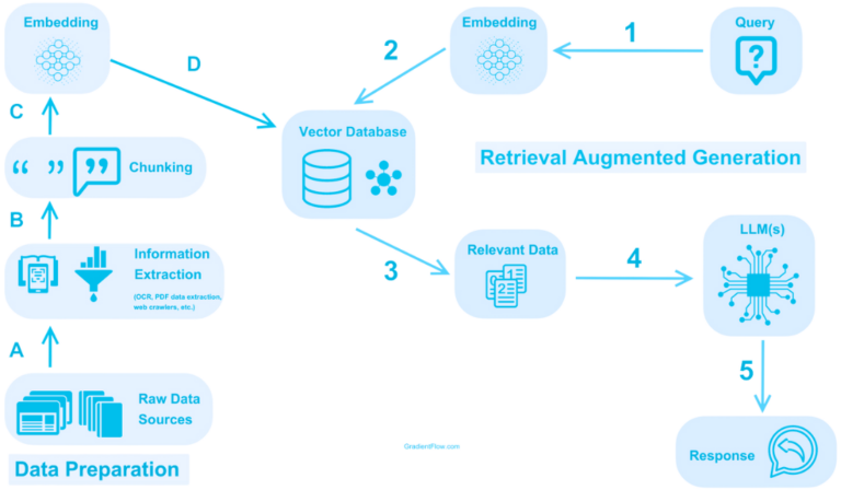 De grote hoeveelheid interne documenten die bedrijven bezitten kunnen verschillende formaten hebben, zoals PDF, Word, webpagina’s, etc. Om informatie uit bedrijfsdocumenten te halen en deze als context te gebruiken voor antwoorden van een taalmodel, moeten de documenten eerst worden voorbereid. Dit betekent dat ze in kleinere stukken (chunks) worden verdeeld. Vervolgens worden deze stukken door een embeddingmodel gehaald, dat ze omzet in hoog-dimensionale vectoren. Deze vectoren vertegenwoordigen de inhoud van elk stuk en helpen bij het vinden van relevante informatie in de bedrijfsdocumenten.